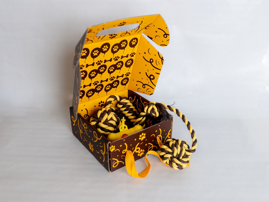 These charming boxes measure 6.5 x 6.5 x 3 inches (16.51 x 16.51 x 7.62 cm), providing ample space to hold all the treats and goodies your dog will enjoy. Crafted from durable 250gsm paper and E flute, each box is sturdy enough to protect its precious contents while maintaining a polished and elegant appearance.